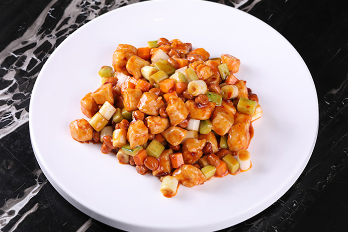 5)加入大蔥粒、熟雜菜、熟雞丁、宮爆調味醬一起炒勻,最后加入炸花生炒勻即可,根據情況補芡。